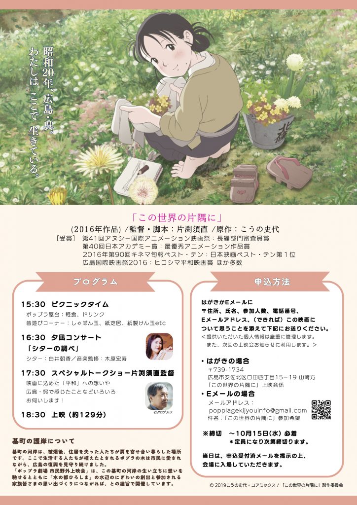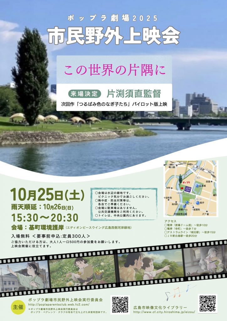 2 10月 2025 ”この世界の片隅に”市民野外上映会を開催します.10月25日(土)15:30開場、17:30片渕須直監督のトークショー、18:30〜20:30頃 上映 基町ポップラ通りにて by wpmaster | posted in: 仲間リスト | 0 最終チラシができました。 参加申し込みをお受けします。ぜひ、基町の水辺で”この世界の片隅に”をご覧ください。チラシでは15日締め切りになっていますが、22日が正解です。よろしくお願いします。