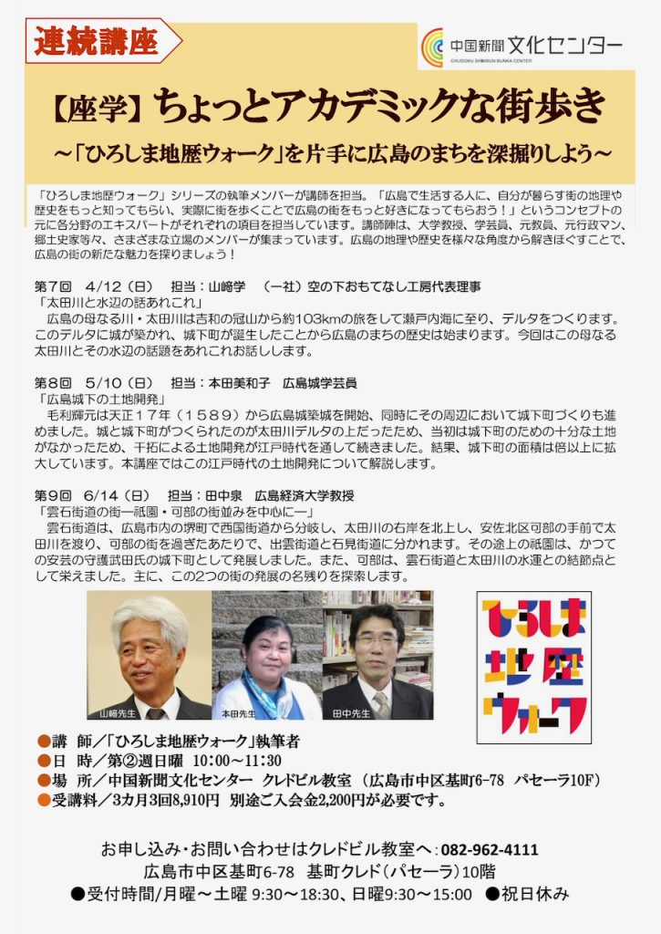 9 3月 2026 ”ちょっとアカデミックな街歩き”講座、4〜6月期の参加募集中です(中国新聞文化センタークレド教室) by wpmaster | posted in: 仲間リスト | 0 「ひろしま地歴ウォーク」シリーズの執筆者が講師を担当する上記講座を令和八年度も継続します。4〜6月期の内容はチラシの通りです。ぜひ、ご参加ください。